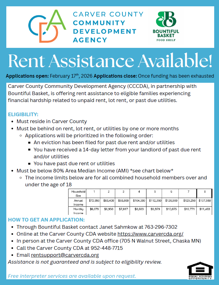 The Carver County Community Development Agency (CCCDA), in partnership with Bountiful Basket, is offering rent assistance to eligible families experiencing financial hardship. Funding is limited and applications will be accepted until funds are exhausted.